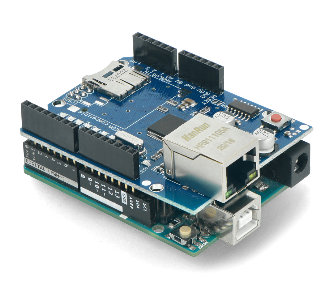 それでは区分けして説明します。下の写真はArduinoとイーサーネットシールドです。